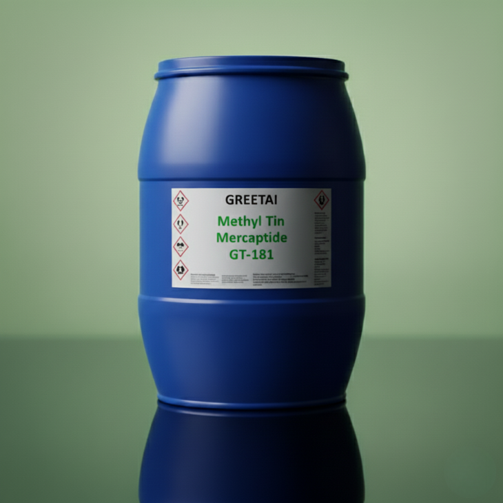 GT-181 is a high-performance heat stabilizer that offers excellent heat stability and superior color retention. Products processed with Tin Stabilizer GT-181 show outstanding transparency, clear color, minimal gas generation, and no educt formation. During processing, GT-181 provides excellent high-temperature stability, color stability, and long-term dynamic performance, while preventing fouling and reducing the need for frequent equipment cleaning. GT-181 is suitable for all types of flexible and rigid PVC processing, including calendaring, extrusion, injection, and blow molding. It can be effectively used in a wide range of PVC applications, such as films for thermal shrinking packaging, printing, calendaring, and twisting, as well as clear flexible and rigid sheets, advertisement sheets, and compound sheets. It is also ideal for PVC granules, electronic apparatus shells, building and construction materials like drinking water pipes, chemical pipes, profiles, and other construction materials, along with medical apparatus, food packaging materials, and daily-use appliances. Under the same processing conditions, a smaller amount of methyl tin mercaptide is required compared with butyl tin or octyl tin to achieve the same stabilizing effect, making GT-181 a highly efficient choice for high-quality PVC production. Packing: GT-181 is supplied in iron drums with plastic coating or in plastic buckets. It is also available in plastic drums, with each drum weighing 220 kg.